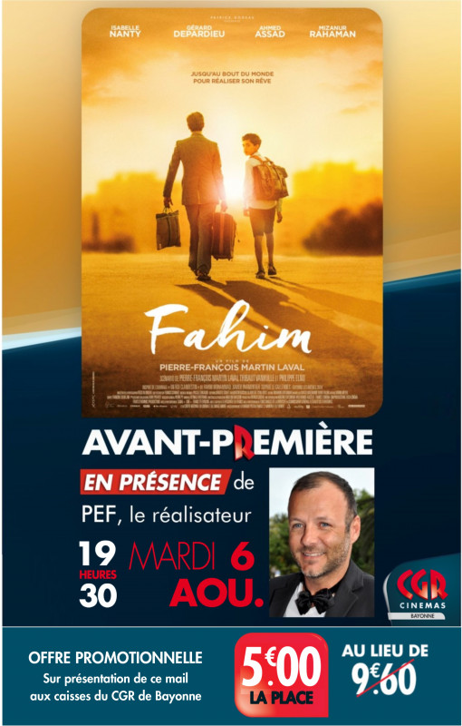 Nous vous informons de l’avant-première du film FAHIM, le Mardi 6 Août à 19H30 au cinéma CGR de Bayonne, en présence du réalisateur Pierre-François Martin-Laval et du joueur de l’équipe de France d’échecs Fahim Mohammad.