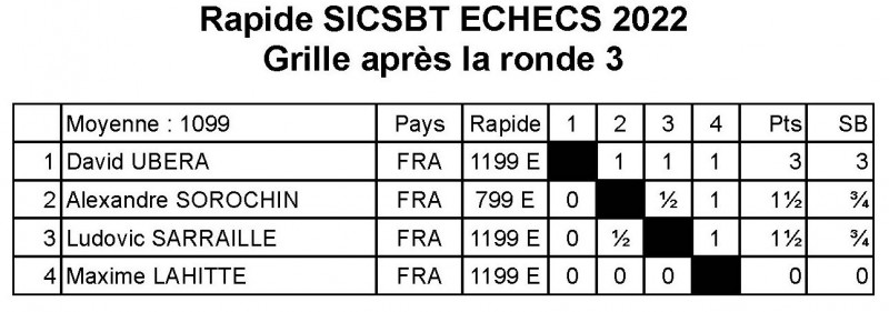 3ème : Ludovic Sarraille, 1,5/3, 2ème ex aequo et 3ème après la partie de départage en blitz de 5 minutes + 5 sec/coup contre Alexandre